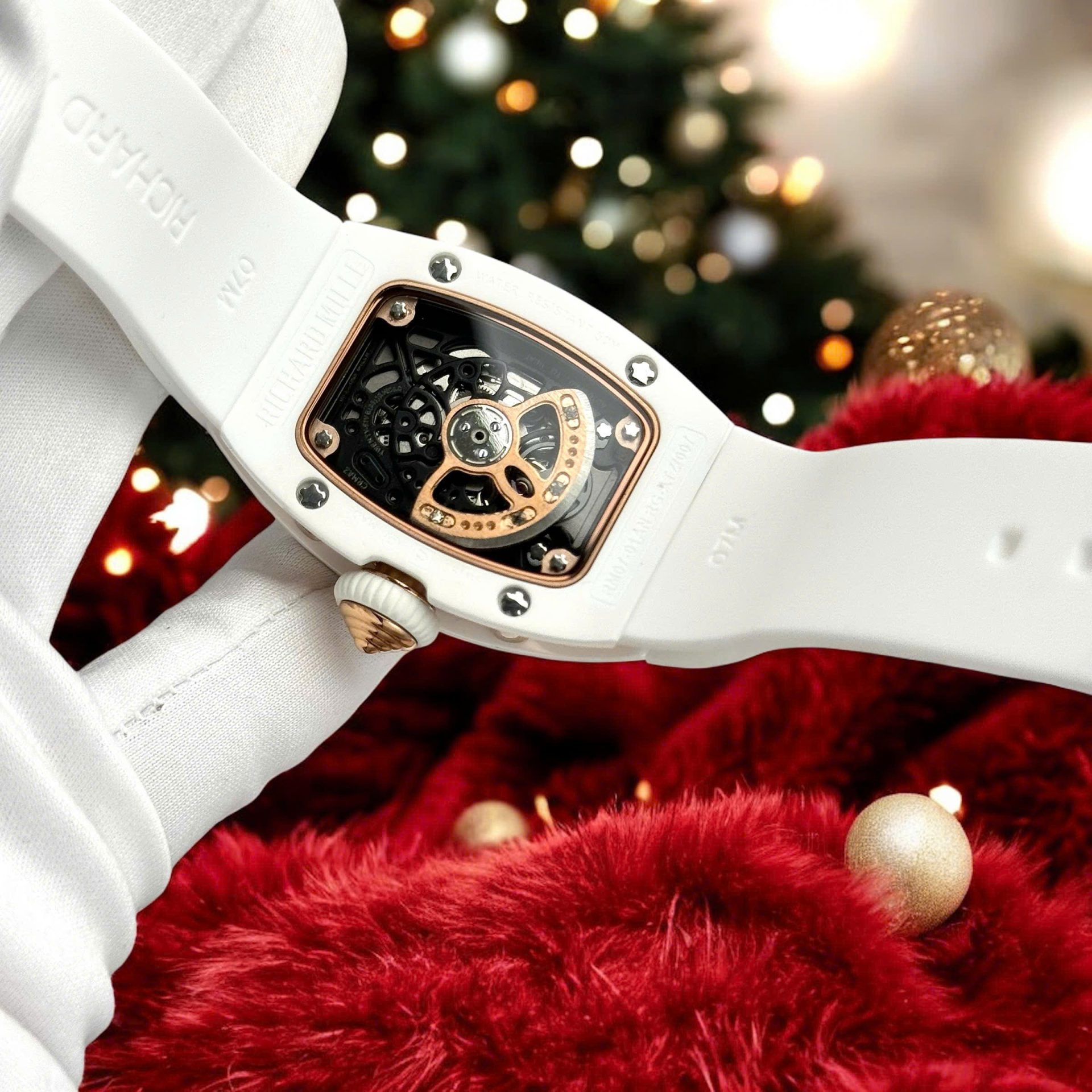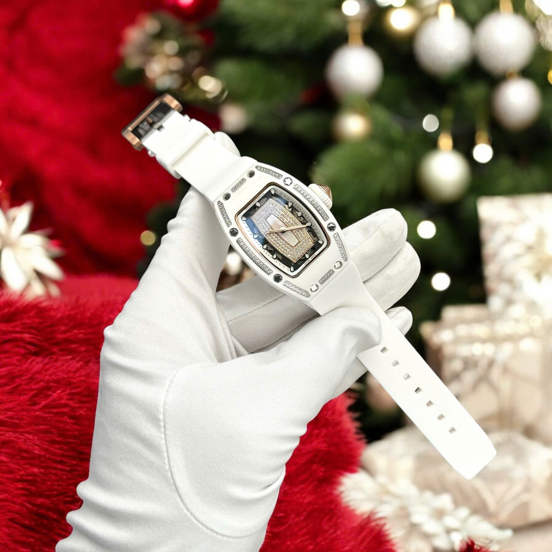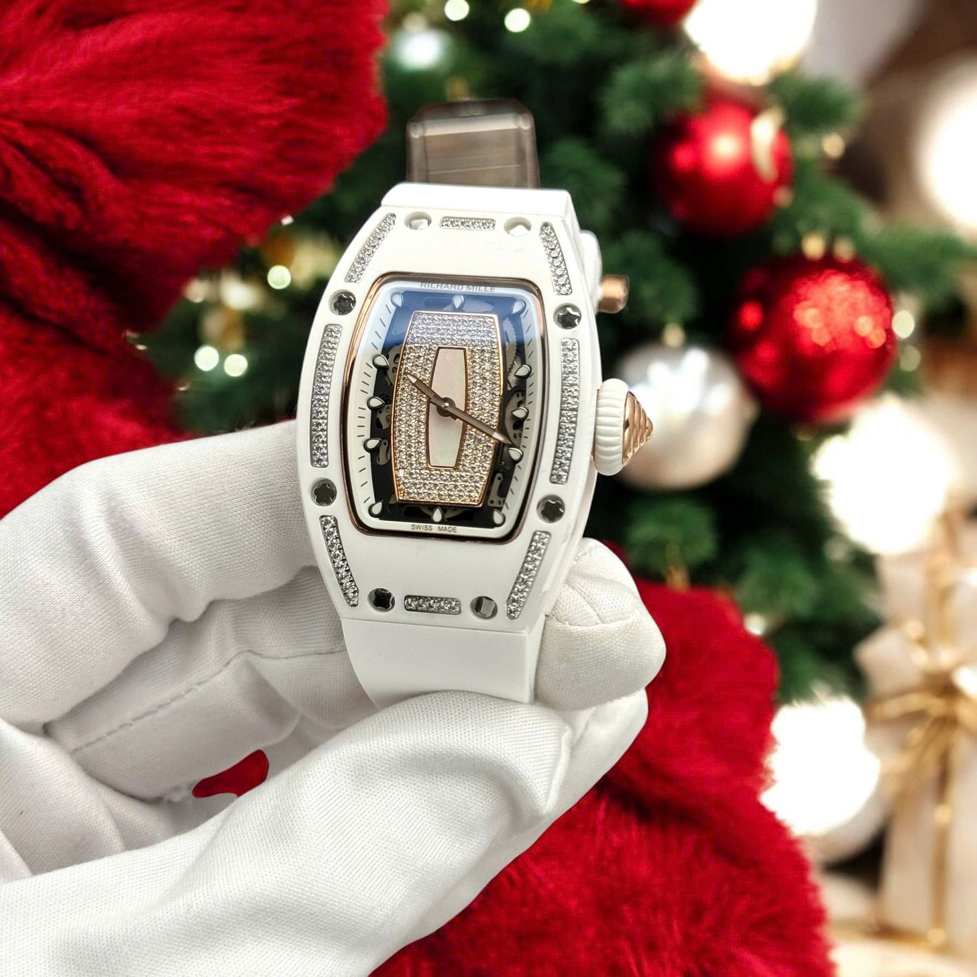 Đồng Hồ Richard Mille Nữ Đính Đá Máy Cơ Automatic Gốm Trắng Dây Cao Su RM07 36mm