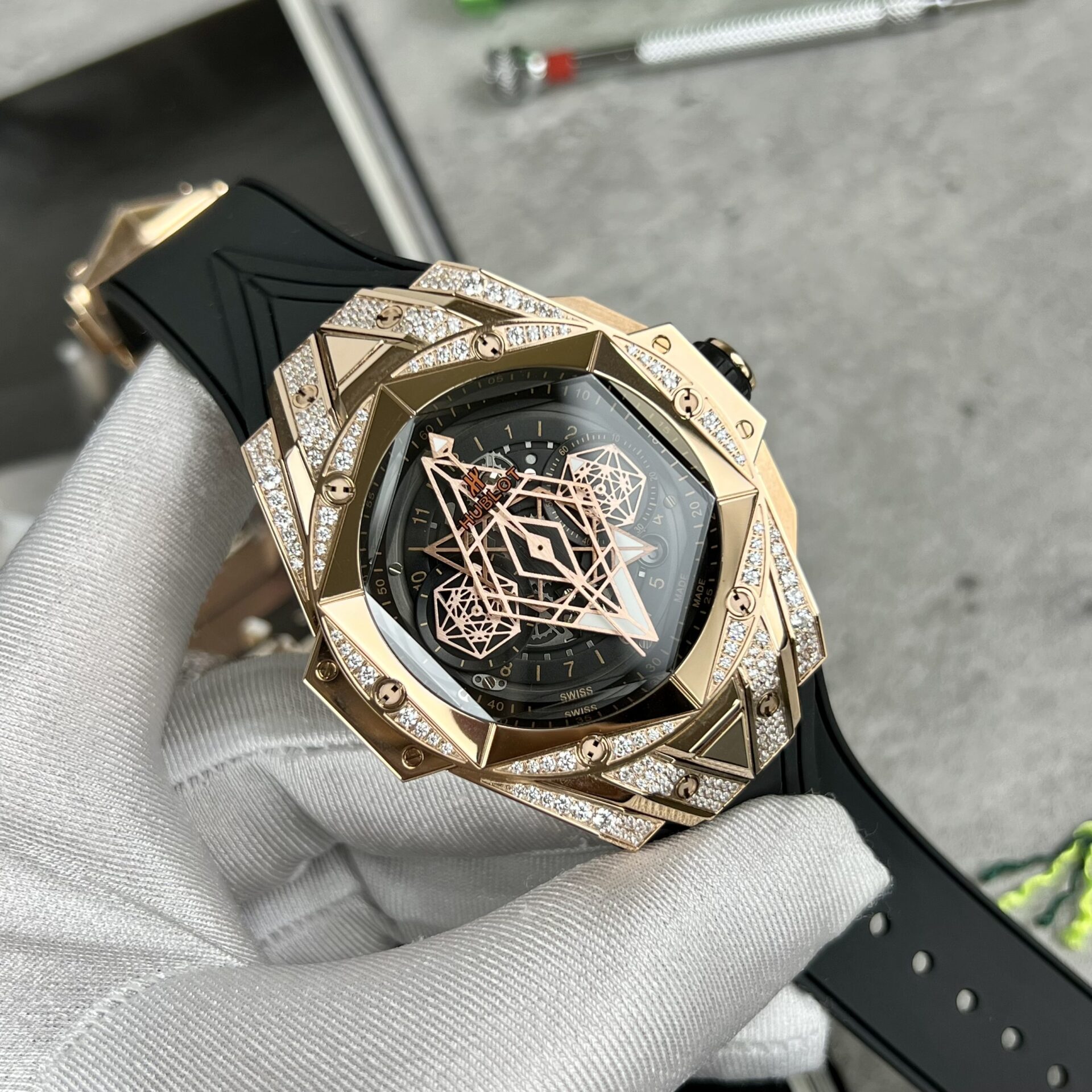 4. Thiết kế đính đá tinh tế: Các mẫu đồng hồ Hublot Replica được trang trí bằng các chi tiết đính đá một cách tinh tế. Các nghệ nhân tạo ra những họa tiết đẹp mắt và tỉ mỉ trên khung máy và mặt đồng hồ, khó có thể phân biệt giữa Auth và Replica mà không cần các thiết bị chuyên dụng.
