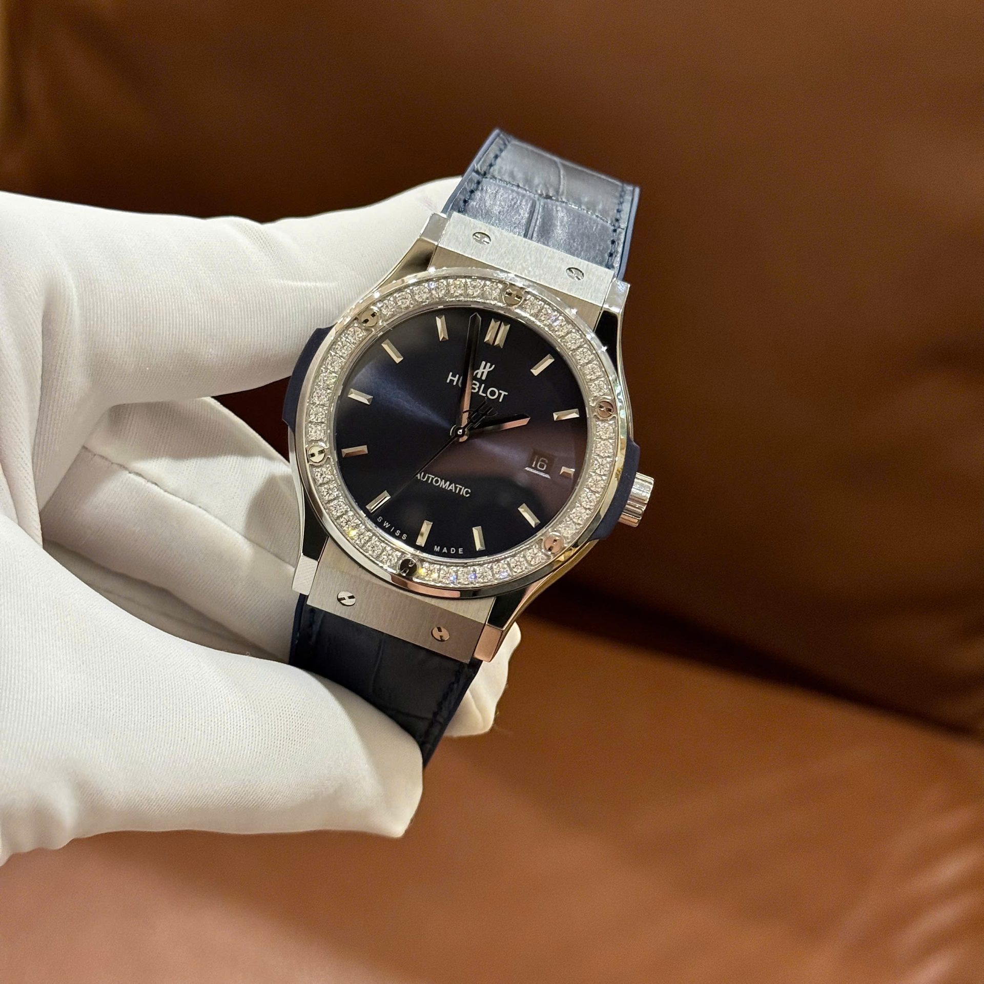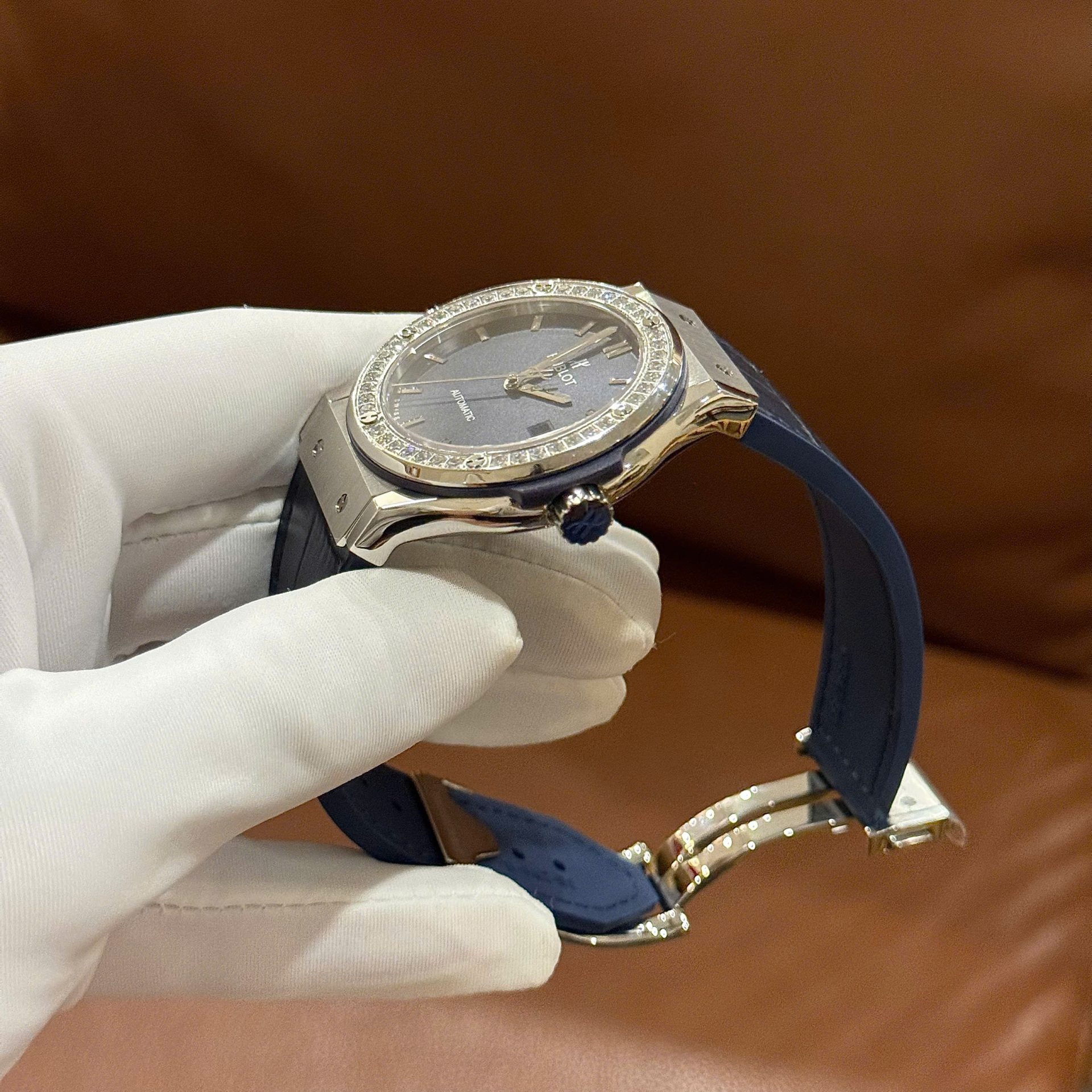 Hublot Classic Fusion Fake Watch Men Blue Dial Bezel Stone CZ HB Factory 42mm