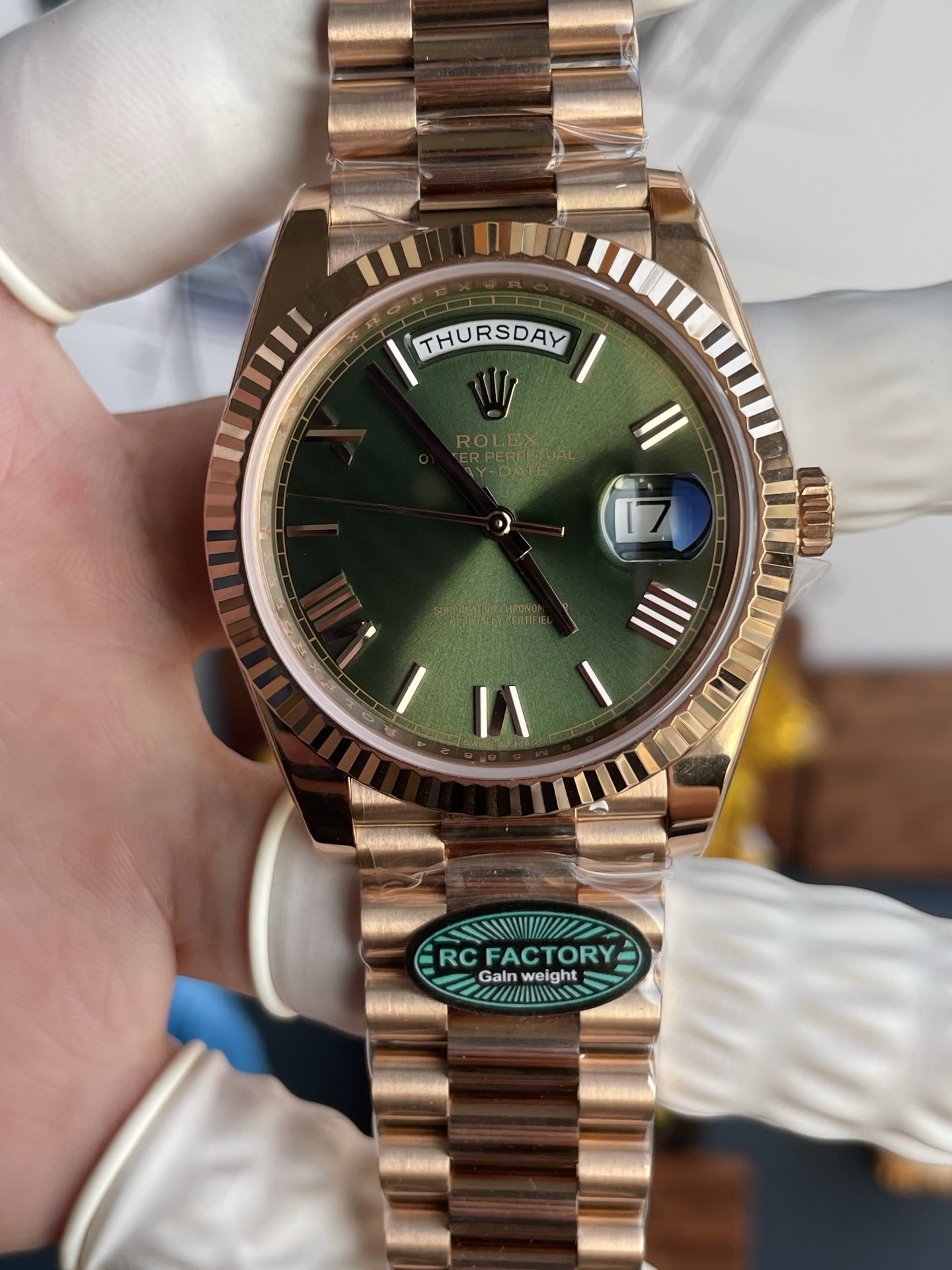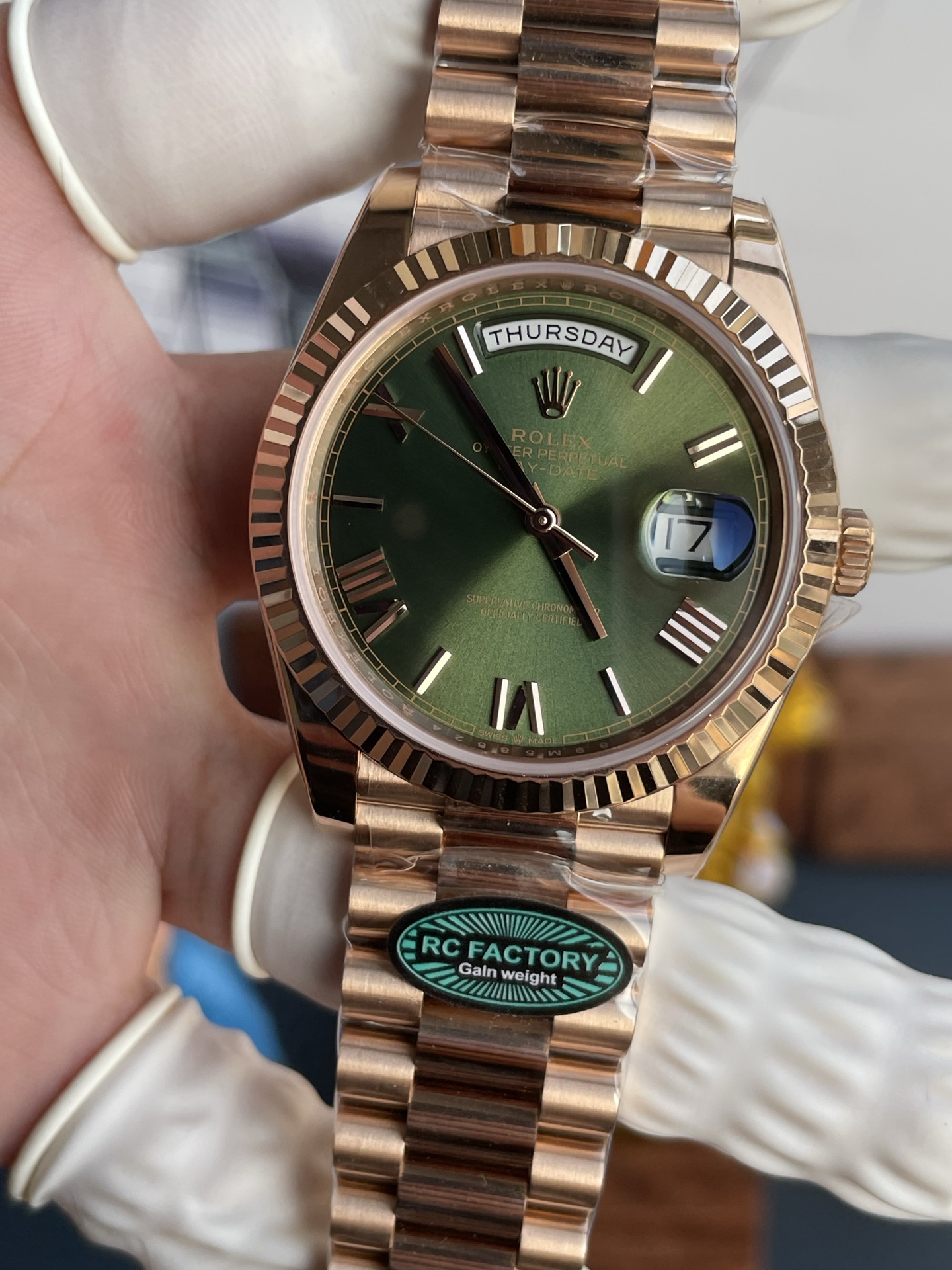 Rolex Day-Date Chế Tác Mặt Xanh Ô Liu Nặng 210 Gram Màu Vàng Hồng Nhà Máy RC 40mm
